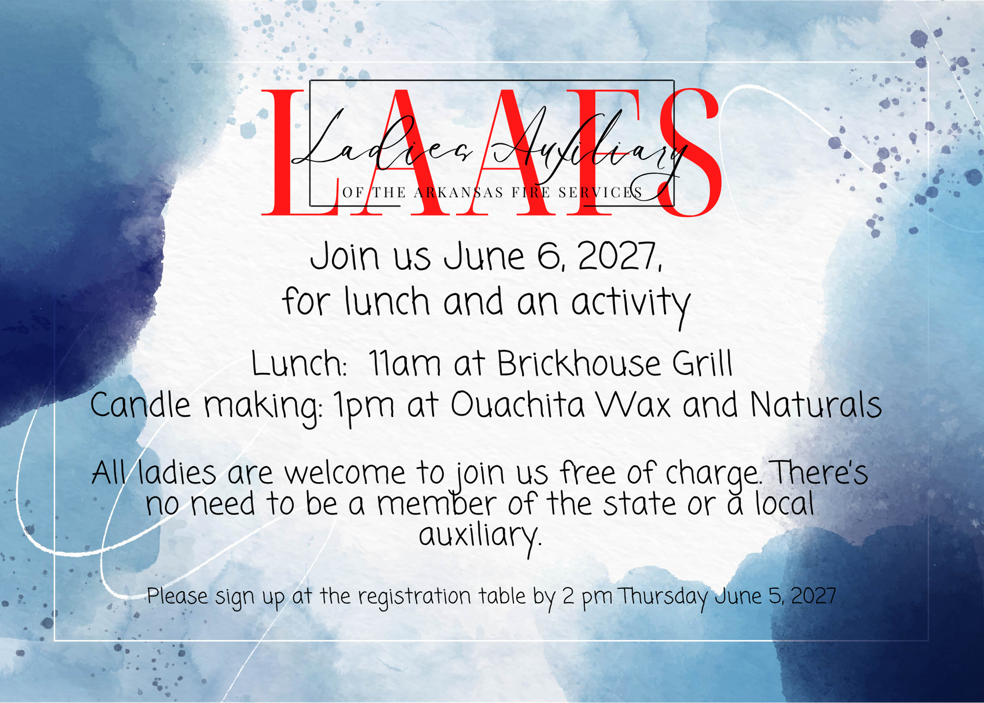 The LAAFS formed by combining two separate auxiliaries at the 2005 convention. The Arkansas Association of Fire Chief’s Ladies Auxiliary and the Arkansas State Firefighter’s Ladies Auxiliary voted to combine their individual groups for the purpose of camaraderie and shared philanthropy. We raise money each year at convention to donate to a fire related charity that is voted on at our Friday business meeting.